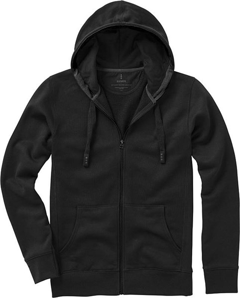 Klasická mikina ze směsového materiálu 80% bavlna, 20% polyesteru, na rubu počesaná. Přední díl celopropínací na zip, kapuce se zdrhovací plochou šňůrkou, sametová lemovka kolem krku a kapuce. Klokaní kapsa. 2x2 žebrovaný úplet manžet a spodní lem.. Gramáž 300g/m2.