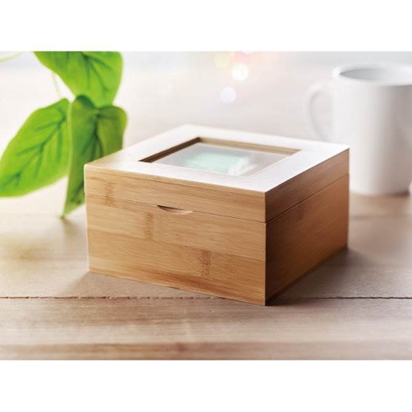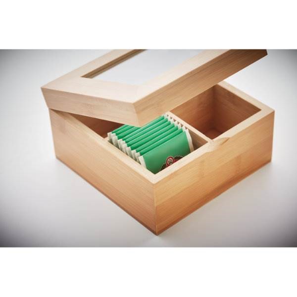 Bambusová čajová krabička s průhledným víkem. Ve 4 rovnoměrně rozdělených oddílech můžete skladovat až 24 sáčků. Bambus je přírodní produkt, jednotlivé kusy se mohou lišit v barvě, taktéž odstín vylaserovaného loga může být u každého kusu jiný.
