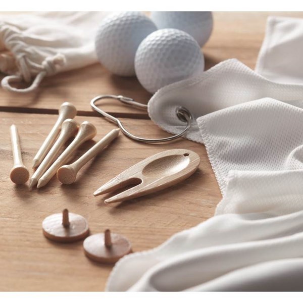 Golfové příslušenství z bambusu. Obsahuje 6 golfových týček, 1 vypichovátko a 2 dřevěné golfové značkovače míčků. Baleno ve stahovacím sáčku z organické bavlny.