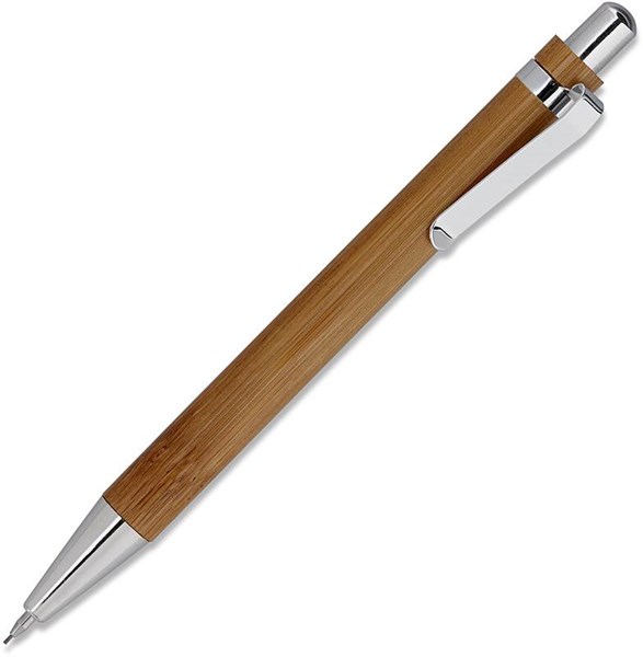 Bambusová sada kuličkového pera a mikrotužky v papírové krabičce. Kuličkové pero obsahuje stylus pro dotykové obrazovky. Kovový klip a špička. Stiskací mechanismus.