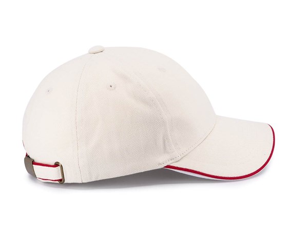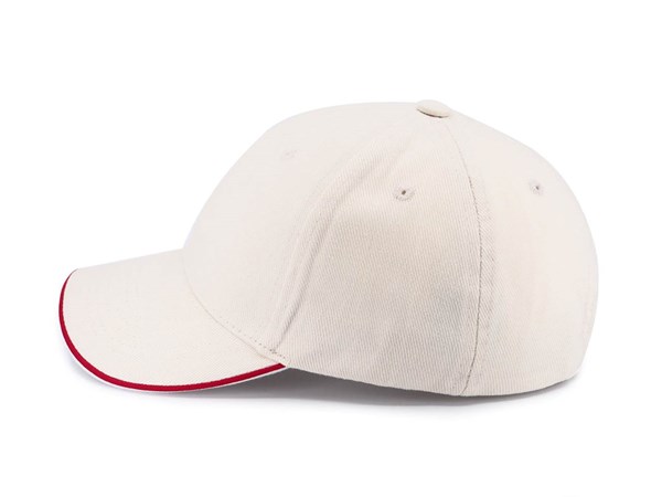 Komfortní šestipanelová čepice z těžké broušené bavlny s kontrastní linkou a odlišnou barvou spodní části kšiltu. Čepice má obšité větrací otvory v totožné barvě, zapínání na kovovou přezku a očko pro nastavení potřebné velikosti, bavlněný potící pásek, vnitřní lem a vyztužené čelo. (Vzhledem k vyztuženému čelu nedoporučujeme nad kšilt výšivku). Univerzální velikost. Čepice je béžová, spodní barva kšiltu bílá, kontrastní linka je červená.