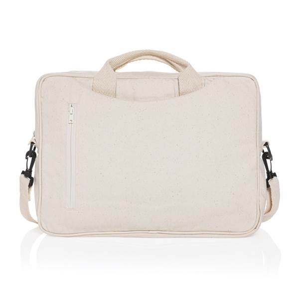 Stylová taška vyrobená z recyklovaného bavlněného kepru. Gramáž tkaniny: 340g/m2. Polstrovaný oddíl pro až 15,4" notebook se zapínáním na suchý zip, praktická přední kapsa, pohodlná ucha a přizpůsobitelný ramenní popruh pro pohodlné nošení. Vyrobeno z recyklované bavlny včetně skenovatelné složky AWARE™ garantující obsah recyklátu. Z výtěžku každého prodaného produktu je přispěno 2 % na podporu iniciativy Water.org.