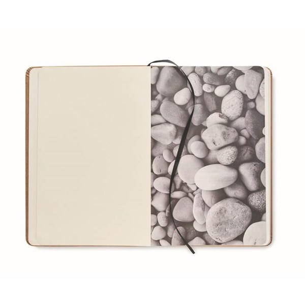 Zápisník A5 s obálkou z recyklovaného kartonu. 160 linkovaných stran z kamenného papíru (80 listů). Zavírání na gumičku a záložka.