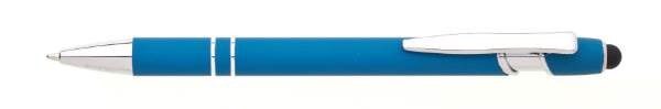 Aluminiové pero se stylus hrotem má otočný mechanismus a modře píšící náplň. Je uloženo v bílém kartonovém boxu.