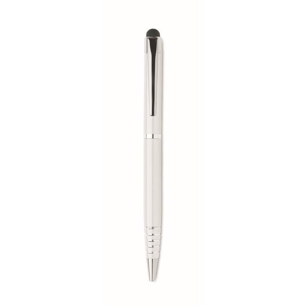 Otočné kuličkové pero z recyklovaného hliníku se stylusem. Modrý inkoust.