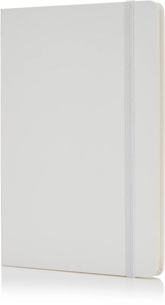 Poznámkový blok formátu A5, elastický popruh, křídový papír na předním a zadním přebalu, oblé rohy, vnitřní stránky v krémové barvě s černými linkami, 160 listů s gramáží 80 g, černá záložka.