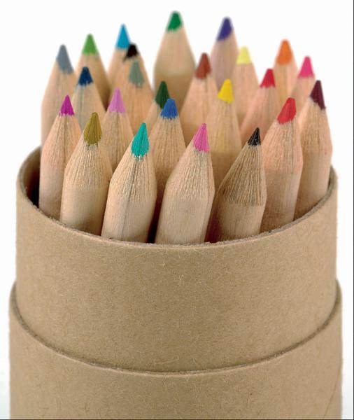 Sada dřevěných barevných ořezaných pastelek, plastové kulaté ořezávátko a guma. Baleno v papírovém boxu ve tvaru válce.