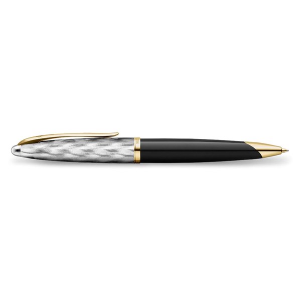 Kuličkové pero s otočným mechanismem, dodáváno s modrou náplní. Černě lakované mosazné tělo a mosazné víčko s vlnkovou reliéfní rytinou vyvedenou leptáním a pokovené palladiem. V kombinaci s pozlacenými doplňky.