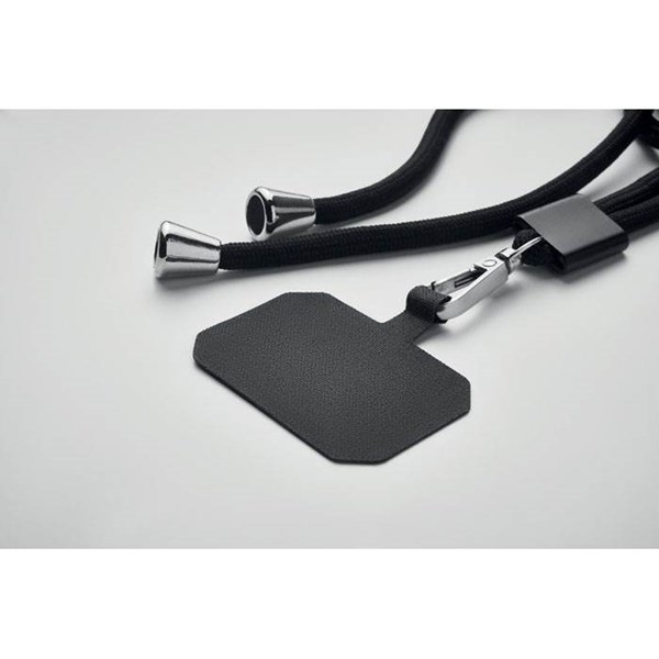 Univerzální RPET šňůrka na telefon s držákem vhodným pro všechny smartphony s pouzdrem. Délka tkanice lze pomocí posuvné přezky upravit na požadovaný rozměr. Součástí šňůrky je plastový držák, který se zasouvá pod obal telefonu, zůstává zde napevno a pokud je potřebsa, lze ho snadno uvolnit pomocí odpojitelného kovového háčku karabiny, přičemž páska zůstane uvnitř pouzdra telefonu, aby bylo možné ji znovu snadno připevnit na šňůrku.