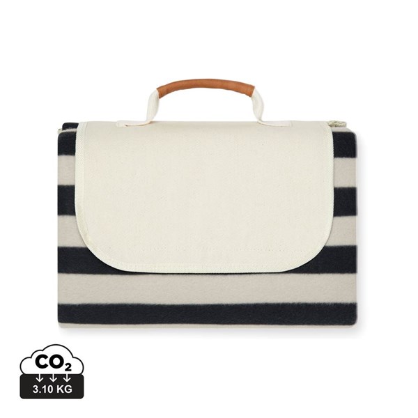 Pikniková deka z měkkého fleecu s detaily z bavlněného canvas a umělé kůže. Fleece je vyroben ze 100 % GRS certifikovaného RPET. GRS (Global Recycle Standard) je globální standard, který umožňuje ověřit použití recyklovaného materiálu v produktu napříč celým dodavatelským řetězcem. Celkový podíl recyklátu dle váhy produktu: 52 %. Spodní část vyrobena z vodu odpuzujícího materiálu PEVA. Chytrá konstrukce pro snadné složení. Materiál: rPET a PEVA. Potisk/ výšivku je možné umístit na klopu.