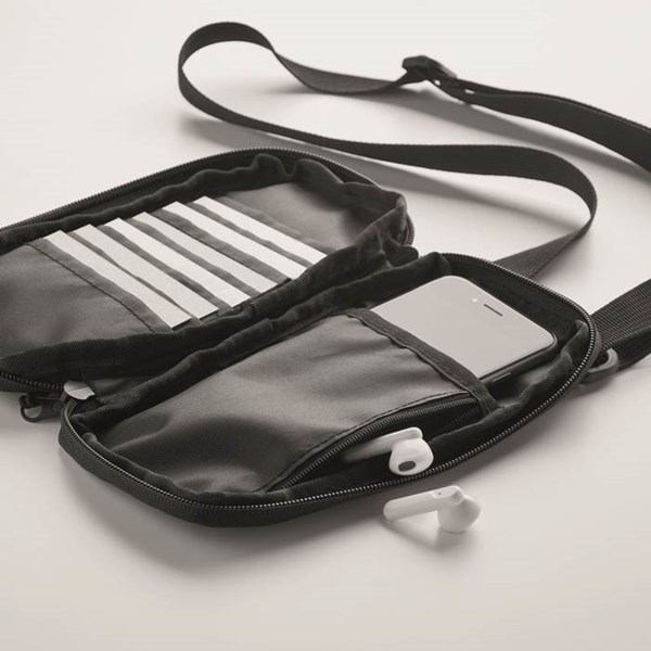 Brašna na smartphone z polyesteru 300D RPET s nastavitelným popruhem přes tělo. Přední a boční kapsa na zip. Hlavní prostor má několik kapes. Obvykle baleno hromadně po více kusech v sáčku