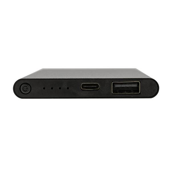 Plochá powerbanka 4 000 mAh vyrobená z recyklovaného hliníku a ABS plastu s RCS certifikací. RCS (Recycled Claim Standard) je globální standard, který umožňuje ověřit použití recyklovaného materiálu v produktu napříč celým dodavatelským řetězcem. Celkový podíl recyklátu dle váhy produktu: 36 %. Kvalitní lithium polymerová baterie řady A s kapacitou 4 000 mAh. Světelné indikátory stupně nabití. USB C vstup: 5V/2A. USB C výstup: 5V/2A, USB A výstup: 5V/2A. Včetně nabíjecího kabelu z recyklovaného TPE. Výrobek je kompletně bez PVC. Baleno v FSC® kraftové dárkové krabičce.