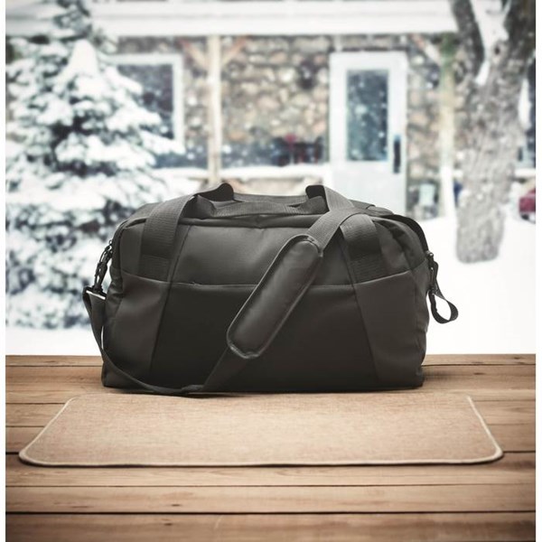 Cestovní sportovní taška z materiálu 300D ripstop s PU detaily a s přední kapsou na zip. Má vnitřní kapsu a 2 malé polstrované přihrádky. Pás pro připevnění na kufr na zadní straně.