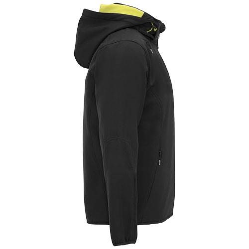 Dvouvrstvý softshell ve sportovním střihu. Kontrastní středový zip s ochranou brady a taháčkem. Vnitřní podšívka z kontrastní mikrofleecové tkaniny. Vnější kapsa na pravé straně hrudníku s neviditelným zipem v diagonálním tvaru. Dvě boční kapsy s neviditelným zipem. Kapsa na levém rukávu. Odpovídající elastické lemování manžet a spodního lemu. Sklopná kapuce s kontrastní mikropolární podšívkou. Odnímatelný štítek. Nepromokavá. Odolná proti větru. Materiál 92% polyester a 8% elastane, 300 g/m2, podšívka micro fleece 100% polyester.