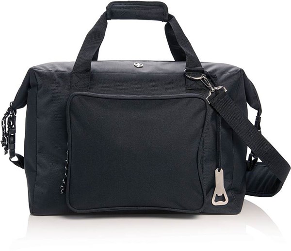 Luxusní polyesterová 1680D a 600D chladicí nákupní taška s extra velkým hlavním oddílem na zip a přední kapsou na zip. Tuto tašku lze zapnutím bočních popruhů jednoduše proměnit na chladicí sportovní tašku.Obrovský prostor 40 l. Pojme až 10 lahví o objemu 1,5 l nebo 52 plechovek. Dvě zesílená ucha. Odnímatelný nastavitelný ramenní popruh. Včetně otvíráku lahví. Izolace PEVA. Obvykle baleno jednotlivě v plastovém sáčku.