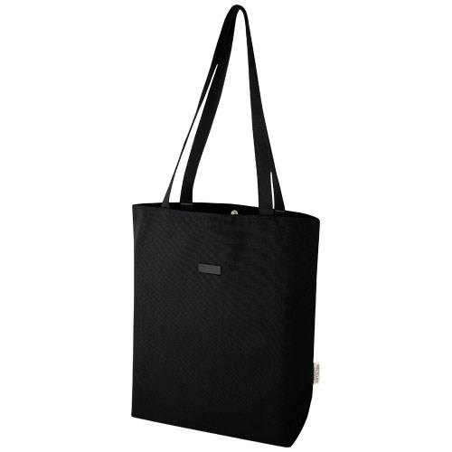 Nákupní taška vyrobená z GRS certifikovaného recyklovaného plátna a GRS certifikované RPET podšívky. Tato všestranná nákupní taška má polstrovanou přihrádku na 15" notebook a dvě vnitřní kapsy na telefon, peněženku nebo příslušenství, snadné zapínání na knoflík a pohodlné bavlněné rukojeti. Díky dekorativní kovové desce vynikne logo s jemným a matným povrchem. Objem 14 litrů.