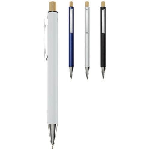 Kuličkové pero Cyrus je vyrobeno z recyklovaného hliníku, což vyžaduje méně energie než výroba hliníku z nerostných surovin. Snižuje také množství odpadu na skládkách a pomáhá šetřit přírodní zdroje s cílem snížit emise skleníkových plynů. Tlačítko je vyrobeno z bambusu. Barva inkoustu: Černá. Délka psaní: 800 metrů. Rozměr hrotu: 1,00 mm.
