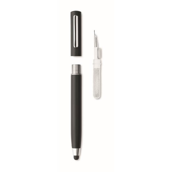 Kuličkové pero z ABS se stylusem. Součástí je sada na čištění sluchátek: kovový hrot, houbička a kartáček. Modrý inkoust.