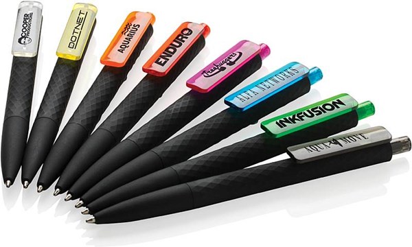 Kuličkové pero z ABS plastu vyznačující se jedinečným diamantovým vzorem po obvodu, spodní úchopová část je hladká. Pero má černé tělo, tlačítko a klip je ve stejné transparentní barvě. Nová verze s povrchovou úpravou smooth touch pro mimořádně komfortní psaní. Německá náplň s modrým inkoustem Dokumental® pro psaní až 1 200m textu. Obvykle baleno jednotlivě v sáčku. Při potisku u nás pera zpět do sáčku nevracíme.