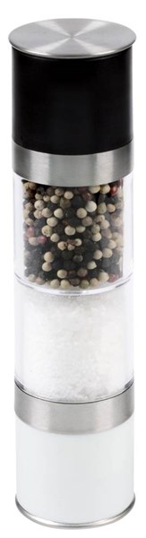 Plastový mlýnek s keramickým plecím mechanismem. Na jedné straně mlýnek na sůl, na druhé mlýnek na pepř. Průhledné plastové tělo, nerezová víčka na přikrytí mlecího mechanismu. Obvykle baleno jednotlivě v transportní kartónové krabičce.