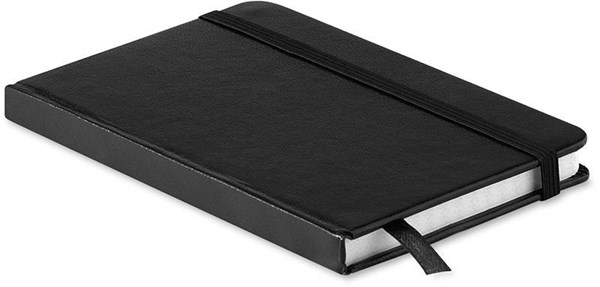 Zápisník formátu A5 v pevných deskách s 96 čtverečkovanými stránkami má textilní záložku a gumovou zajišťovací pásku v barvě bloku.