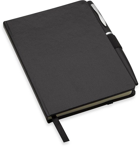 Zápisník formátu A5 s kartonovými deskami má 72 linkovaných stran, textilní záložku, zajišťovací pružnou pásku a poutko na pero v barvě zápisník. Součástí bloku je barevné kovové kuličkové pero s modře píšící náplní.