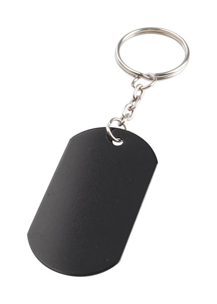 Hliníková destička ( 5,4 x 2,9 cm) s oblými rohy, řetízkem (délka 3 cm) a kroužkem na klíče. V nabídce výběr z několika barev. Potisk lze umístit z obou stran destičky. Z důvodu zamezení poškrábání je předmět obvykle balen jednotlivě v sáčku.