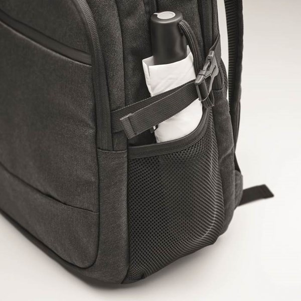Batoh na 15 palcový notebook z polyesteru 600D RPET. Tři velké plně polstrované vnější přihrádky na zip s několika vnitřními kapsami, dvě boční kapsy ze síťoviny, nastavitelné ramenní popruhy, polstrovaná zádová část ze síťoviny pro lepší proudění vzduchu, držák na kufr na kolečkách na zadní straně. Obvykle baleno hromadně po více kusech v sáčku.