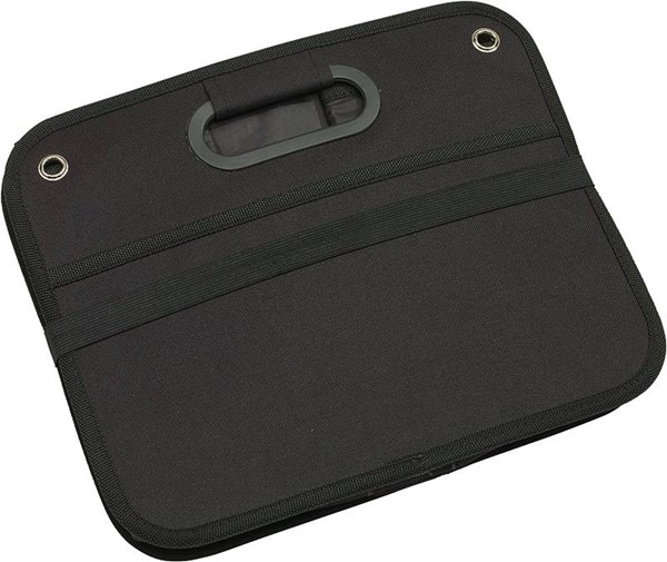 Skládací box do zavazadlového prostoru auta je vyroben z polyesteru 600D, má vyztužené rukojeti, 2 samostatné přihrádky a 1 kapsu ze síťoviny. Rozměr složeného boxu 320 x 260 x 40 mm. Tisk na kratší stranu s madlem.