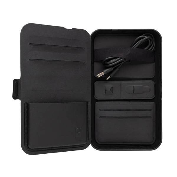 Pevné cestovní pouzdro s integrovanou bezdrátovou nabíječkou 3 v 1 vyrobené z recyklovaného PU RCS. Celkový recyklovaný materiál: 5 % na základě celkové hmotnosti produktu. Certifikace RCS zajišťuje kompletně certifikovaný dodavatelský řetězec recyklovaných materiálů. Cestovní pouzdro má úložný prostor pro cestovní pas několik karet. Cestovní pouzdro je vybaveno magnetickou 15W bezdrátovou nabíječkou, 5W bezdrátovou nabíječkou vhodnou pro pouzdro na sluchátka nebo jiná malá zařízení s možností bezdrátového nabíjení a 2,5W bezdrátovou nabíječkou pro chytré hodinky (pouze hodinky Apple). Součástí balení je 120 cm kabel TPE. Baleno ve směsném obalu FSC. Pouzdro a příslušenství 100% bez PVC. Minimální příkon: 9V/3A pro optimální použití. Výstup: Telefon: 9V/1.1A; 9V/1.67 A/(15W), Sluchátka: 5V/1A (5W), Hodinky: 5V/0.5A. V ceně zboží je zahrnut recyklační příspěvek na likvidaci elektroodpadů ve výši 0,84 Kč.