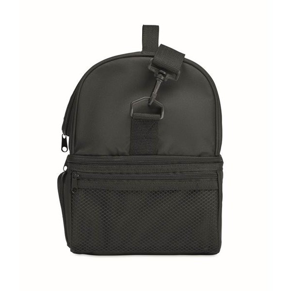 Izolovaná termotaška z 600D RPET včetně opakovaně použitelné krabičky z PP o objemu 1900ml. Se 2 sekcemi pro samostatné skladování teplých a studených potravin. Nastavitelný a odnímatelný ramenní popruh. 2mm podšívka z hliníkové fólie.