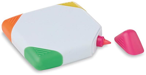 Čtvercový zvýrazňovač obsahuje 4 barvy: žlutá, fuchsia, oranžová a zelená.