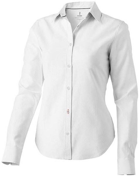 Dámská košile značky ELEVATE gramáže 140g/m2 s dlouhým rukávem. Dámský střih mírně propasovaný. Bílé knoflíčky s gravírováním loga Elevate. Druhá knoflíková dírka od spodního lemu s oranžovým stehováním. Logo tištěné v barvě na zádech. Hedvábné lemování vnitřního výstřihu. Manžetky se dvěma knoflíčky pro nastavení velikosti. Rozparek rukávu se zapínáním na knoflík. Materiál 100% bavlna.