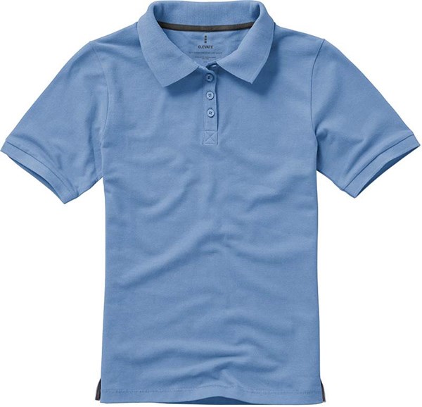Dámská polokošile značky ELEVATE ze 100% bavlny, vysrážená, piqué steh, žebrovaný 1 x 1 límec a manžeta na rukávu. Saténový pásek vypodložení u krku. Vypodložené saténové rozparky po stranách. Logo vytištěné na zadním dílu trička. Přední díl na čtyři knoflíky s vyrytým logem v barvě košile.