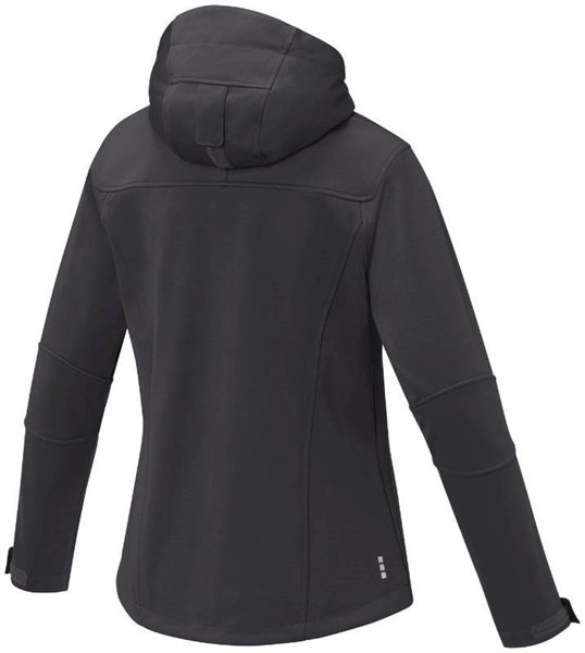 Dámská sportovní bunda z prodyšného a větru i vodě odolného třívrstvého softshellového materiálu (žerzejový úplet 90% polyester a 10% elastan, TPU, 100% polyesterový microfleec). Gramáž bundy 360 g/m2. Voděodolnost 3000mm, prodyšnost 3000 g/m2, tvarované švy, kapuce se stahovací šňůrkou, přední kapsy a kapsa na rukávu na zipy, středový přední kontrastní otočný zip, spodní lem bundy zakončen elastickou stahovací šňůrkou, manžety na rukávech zakončeny suchým zipem, prodloužená záda. Dámské provedení je mírně vypasované.