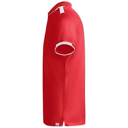 Antibakteriální látka z recyklovaného polyesteru. 1 × 1 žebrovaný límec a detail na rukávech. Zesílené kryté švy v límci. Zapínání na 2 skryté knoflíky. Kontrastní detaily a ramena. Boční rozparky na lemu. Odnímatelný štítek. Piqué úplet s cool fit úpravou z 50% recyklovaného polyesteru a 50% polyesteru, 140 g/m2.