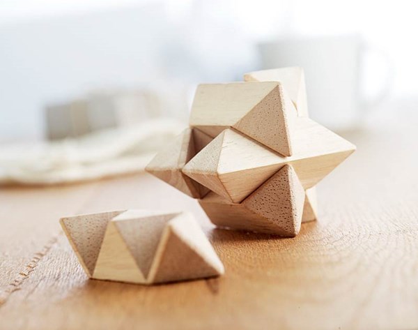 Dřevěný hlavolam, který se složí do tvaru hvězdy, je uložen v bavlněném stahovacím sáčku. Potisk doporučujeme na tento látkový obal.