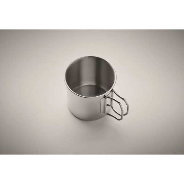 Jednostěnný hrnek z nerezové oceli se skládacím uchem. Objem: 330 ml. Jednotlivě baleno v krabičce. Cenu rotačního laserového rytí (plocha 200x60 mm) zkalkulujeme na vyžádání.
