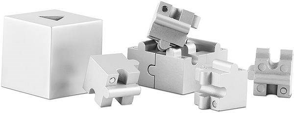 Magnetická základna a kovové kusy tvoří puzzle v rozměru 3D, které lze použít pro pobavení nebo jako těžítko.