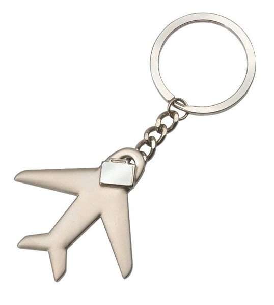Přívěsek ve tvaru letadla s řetízkem, malým kovovým kufříkem a přídavným kroužkem na klíče. Materiál: slitina zinku, ocel. Součástí je dárková papírová krabička.
