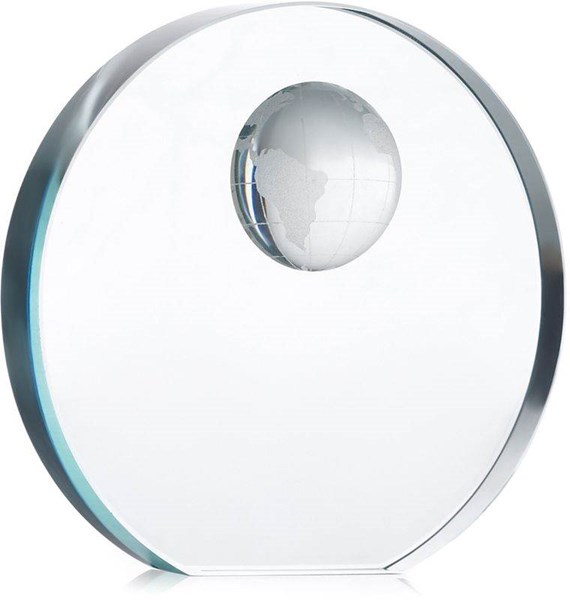 Elegantní skleněná kulatá trofej v horní části zdobená reliéfně polovinou zeměkoule. Dodáváno v dárkové krabičce.