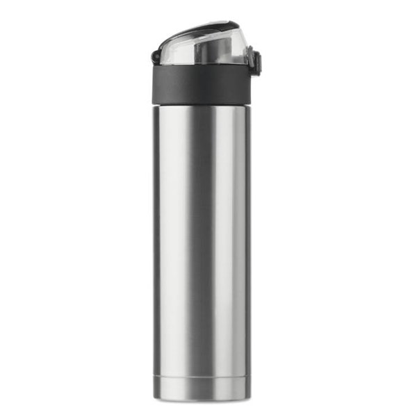 Nerezová 400ml láhev na pití s bezpečnostním uzávěrem a otvíráním "press-to-open". Skládací rukojeť pro lepší nošení.