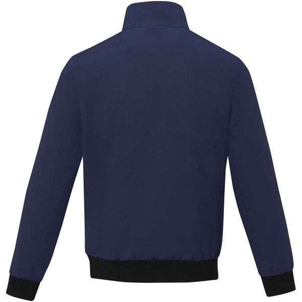 Žebrované manžety a spodní lem z plochého úpletu. Chlopeň chránící před deštěm s chráničem brady. Detaily předního švu. Obrácený přední spirálový zip uprostřed. Přední lemované kapsy se zipem. Gumová závěsná smyčka se značkou. Potisk štítku technologií heat transfer pro větší pohodlí. Bavlněný kepr 240T s čirou TPU laminací ze 100% polyesteru, 188 g/m2, podšívka 210T taft ze 100% polyesteru, 60 g/m2.