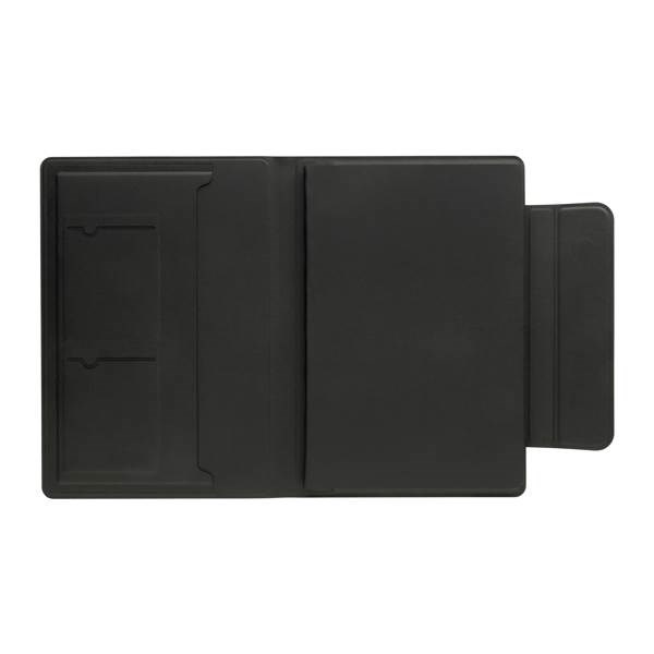 Portfolio A5 z recyklovaného polyester PU s magnetickým zavíráním a magnetickým držákem na telefon, který je kompatibilní s telefony iPhone 12 a vyššími. Unitř je linkovaný papír. Listy jsou certifikovány FSC a mají 64 listů/128 stran. Gramáž papíru 80 g/m2. Dále obsahuje kapsu na dokumenty a 2 sloty na vizitky. Zápisník je znovu naplnitelný.