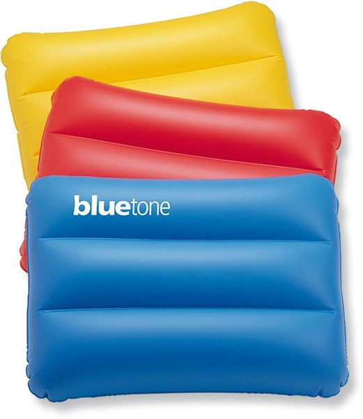 Modrý plážový nafukovací polštářek. Nelze tisknout do prostředního pole. Doporučená délka tisku je max 60 x 30 mm, sítotisk pouze jednou barvou.