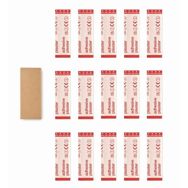 Náplasti v krabičce z recyklovaného papíru. Jedno balení obsahuje 15ks. Potisk lze umístit jen na jednu stranu krabičky, na spodní straně jsou předtištěny zákonné informace.