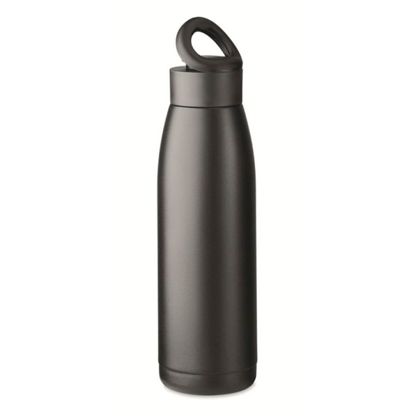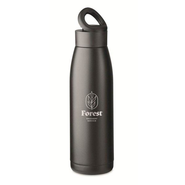 Dvoustěnná láhev z recyklované nerezové oceli (90 % recyklované nerezové oceli a 10 % nerezové oceli) s měkkým silikonovým poutkem. Jednoduchým zatřesením se teplota povrchu láhve změní na zahřívací nebo chladicí, v závislosti na tekutině uvnitř. Objem 400 ml. Cenu rotačního sítotisku (190x100 mm - max. 1 barva), nebo digitálního plnobarevného rotačního tisku či laseru (217x115 mm) zkalkulujeme na vyžádání).