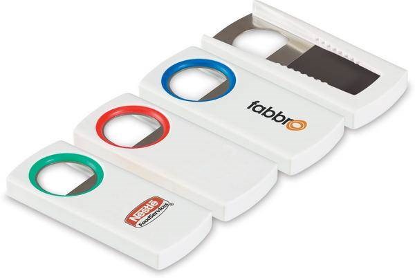 Bílý plastový otvírák včetně uzávěru na láhve v kombinaci s modrým kroužkem.