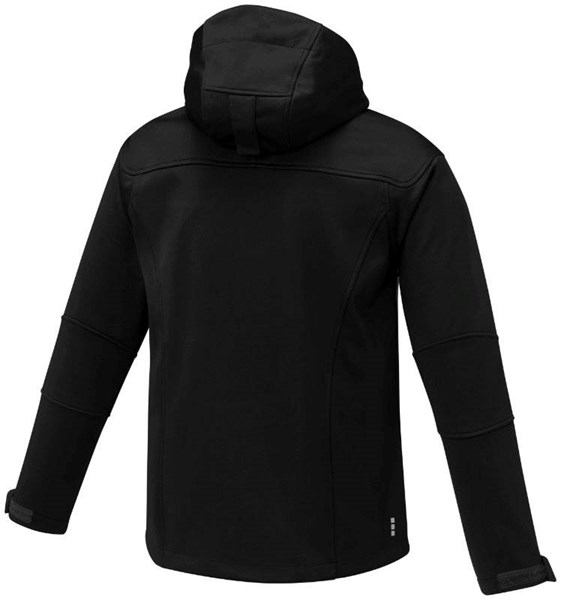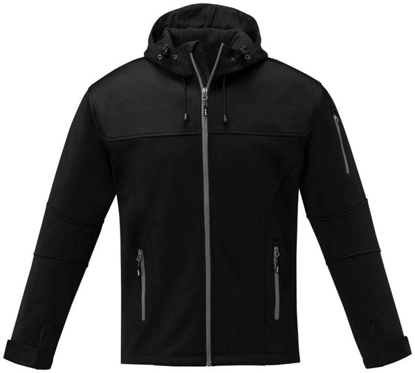 Pánská sportovní bunda z prodyšného a větru i vodě odolného třívrstvého softshellového materiálu (žerzejový úplet 90% polyester a 10% elastan, TPU, 100% polyesterový microfleec). Gramáž bundy 360 g/m2. Voděodolnost 3000mm, prodyšnost 3000 g/m2, tvarované švy, kapuce se stahovací šňůrkou, přední kapsy a kapsa na rukávu na zipy, středový přední kontrastní otočný zip, spodní lem bundy zakončen elastickou stahovací šňůrkou, manžety na rukávech zakončeny suchým zipem, prodloužená záda.