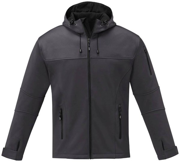 Pánská sportovní bunda z prodyšného a větru i vodě odolného třívrstvého softshellového materiálu (žerzejový úplet 90% polyester a 10% elastan, TPU, 100% polyesterový microfleec). Gramáž bundy 360 g/m2. Voděodolnost 3000mm, prodyšnost 3000 g/m2, tvarované švy, kapuce se stahovací šňůrkou, přední kapsy a kapsa na rukávu na zipy, středový přední kontrastní otočný zip, spodní lem bundy zakončen elastickou stahovací šňůrkou, manžety na rukávech zakončeny suchým zipem, prodloužená záda.